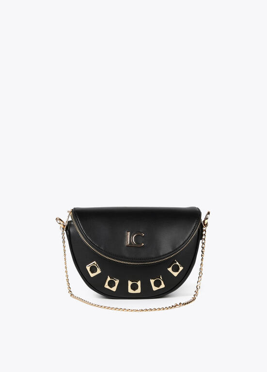 BOLSO EN FORMA DE MEDIA LUNA CON SOLAPA Y CIERRE CON CREMALLERA, CON ADORNOS GEOMETRICOS